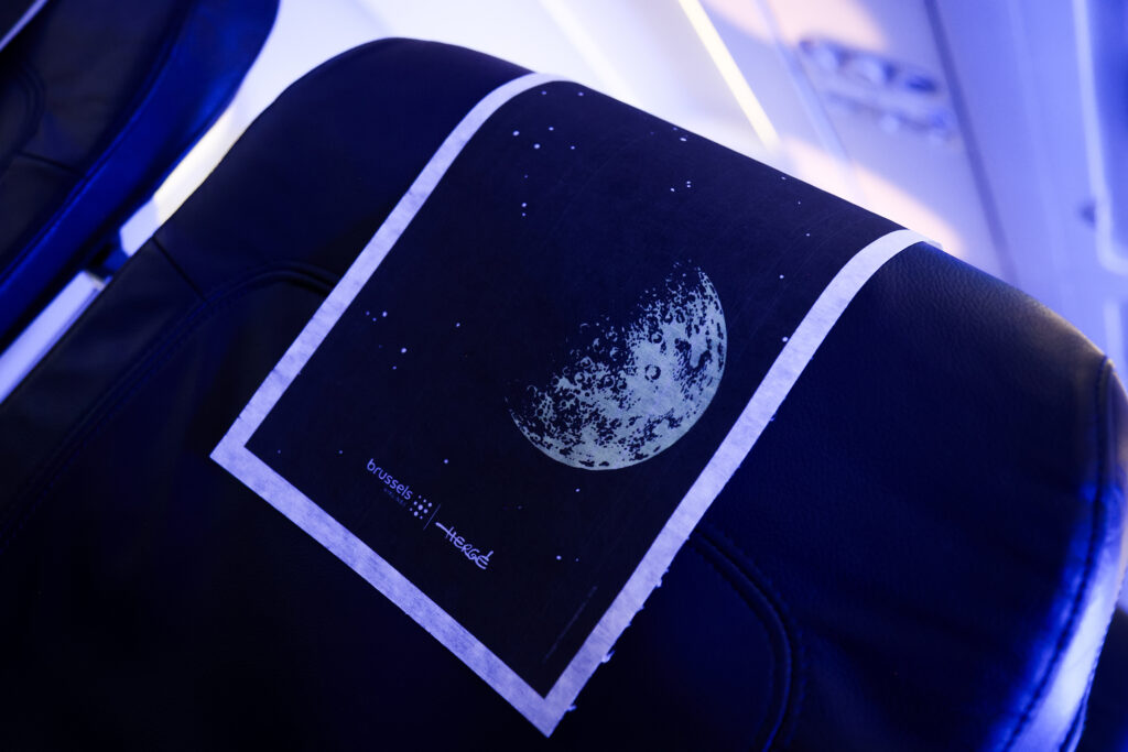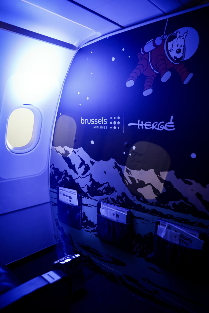 The Tintin experience continues inside the aircraft as the entire cabin interior (including the overhead compartments) was decorated with various Tintin visuals representing the reporter’s lunar endeavours (like a comic-book panel: the rocket taking off from Earth, the risk of encountering an asteroid,…), as well as Hergé’s handwritten quote “A force de croire en ses rêves, l’Homme en fait une réalité” (“By believing in his dreams long enough, Man turns them into reality“).